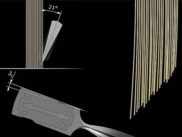 Im neuen Calligraphen The 21 ist der 21-Grad-Winkel fest vorgegeben und integriert. Damit können wir das Haar garantiert in einem konstanten Winkel schneiden, wobei Abweichungen ausgeschlossen sind. Die fest verankerte Klinge verhindert ein Flattern, das selbst erfahrene Calligraphisten mit dem Vorgängermodell nie vollständig vermeiden konnten. Der saubere Schnitt erfolgt nahezu gratfrei, wodurch das Haar deutlich weniger zu Spliss neigt.